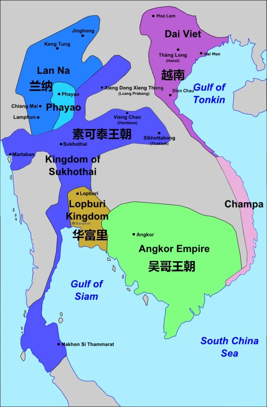 公元13世紀後,吳哥帝國因為國內政治混亂迅速衰落。生活在吳哥帝國北部的泰人趁此機會先後建立了素可泰、清邁、蘭納等割據政權,這些政權一開始為了自身的獨立,聯合起來共同抵抗吳哥帝國。
