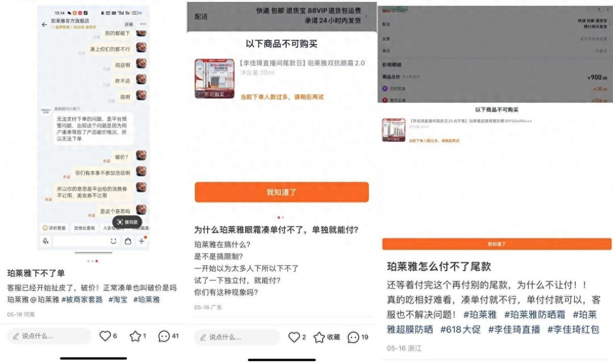 有網友懷疑是賬號問題,但一消費者上傳了其與珀萊雅官方旗艦店客服的聊天截圖,圖片顯示,珀萊雅客服稱,“無法支付下單的問題,是平台預警問題,出現這個問題是因為用户湊單導致了產品破價情況,所以無法下單”。