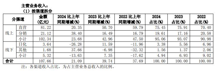 財報顯示,2024年,珀萊雅實現營業收入107.78億元,同比增長21.04%;歸屬於上市公司股東的淨利潤15.52億元,同比增長30%。營業收入和歸屬於上市公司股東的淨利潤均實現兩位數增長,珀萊雅的成績看起來不錯,但是,2022年,這兩項指標的同比增速分別為37.82%和47.88%,2023年,這兩個數字分別為39.45%和46.06%。與2022年和2023年相比,珀萊雅的營業收入和歸屬於上市公司股東的淨利潤的增速都在放緩。