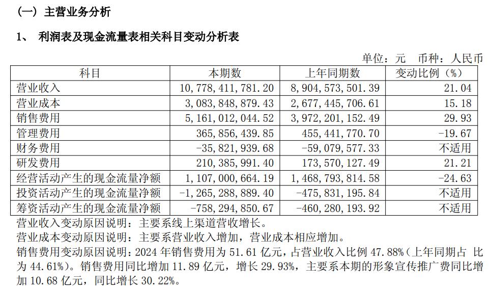 線上收入佔比過高帶來的另一挑戰也不能忽視,2024年,珀萊雅的銷售費用較2023年增長了29.93%,佔當年營業收入的47.88%。對於銷售費用同比增加,珀萊雅表示主要是因為形象宣傳推廣費同比增加30.22%導致的。