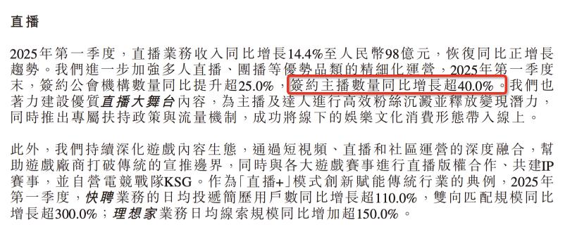 數據顯示,在 2025 年第一季度,快手直播業務收入增長了 14.4%,達到 98 億元,實現了同比正增長。