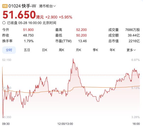 5 月 28 日,在快手發佈 2025 年第一季度財報的次日,快手的港股股價出現了最高達 6.97% 的上漲幅度,並最終以 5.95% 的增幅收盤,落定在 51.65 港元——而在此前一週,快手的股價一直徘徊在 50 港元以下。