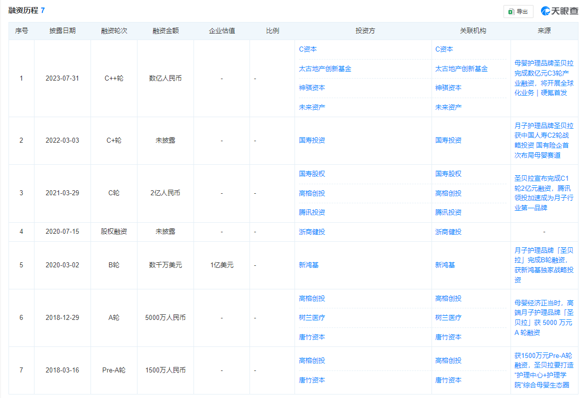 天眼查數據顯示,聖貝拉完成7輪融資,總融資額超過10億元。投資方包括騰訊持股11.6%、高榕資本持股8.3%,另外還有中國人壽、太古地產、C資本和神騏資本等等。