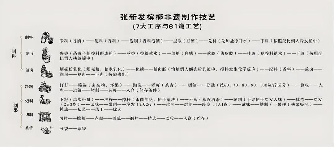 張新發製作技藝作為湖南非物質文化遺產,沿用中藥炮灸、修事、修治之法,分制料與制果2大部分,制料、製漿、制滷、淨制、炮製、切制、分裝7大工序,經篩、選、煮、曬、戛、烘、洗、撩、涼、滷、發、燜、刷、滾、切、分、挑、點、晾等61道工藝炮製而成。其工序考究合理,選料精細,成為行業製作技藝的代表。