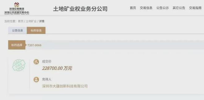 5月28日,深圳公共資源交易中心公佈T207-0066宗地出讓結果,深圳市大疆創新科技有限公司以22.87億元競得,擬打造智能航空系統產業生態全球總部項目。