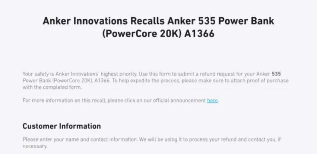 召回535充電寶時,安克官方提供的信息提交頁面