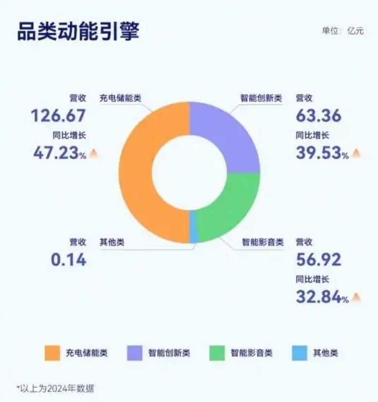 相關數據顯示,安克創新在充電儲能、智能創新和智能影音三大品類中均表現出色,尤其是儲能業務成為新的增長引擎。據悉,包括充電寶、充電器等品類在內的充電儲能類產品在2024年表現尤為突出,貢獻了126.67億元的收入,同比增長47.23%,佔總營收的51.26%。