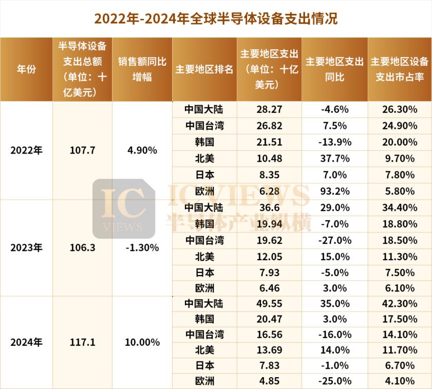 從中國大陸半導體設備支出金額佔比來看,2023年該市場佔到全球半導體設備銷售超三分之一的市場份額,2024年這一數字更是接近一半。韓國和中國台灣的設備支出佔比正在逐步減少。