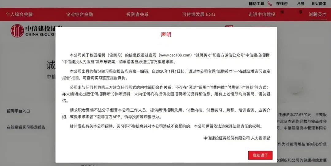 同日,中信建投證券在官網發佈聲明,提出未與任何其他第三方建立任何形式的內推簡歷合作關係,請求職者警惕所謂招聘錄用、付費實習、兼職、培訓諮詢、業務介紹等詐騙行為。