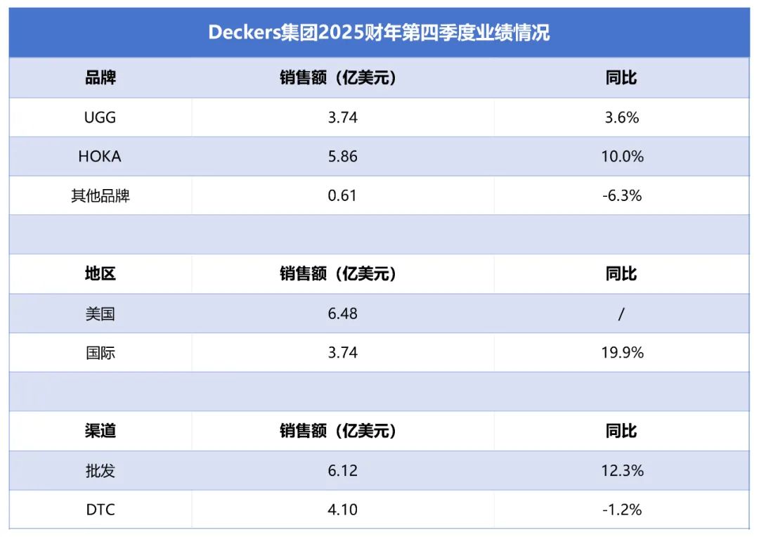 近日,HOKA及UGG母公司 Deckers 公佈截至2025年3月31日的2025財年業績。報告期內,公司總營收同比增長16.3%至49.86億美元,淨利潤增長27.2%至9.66億美元。