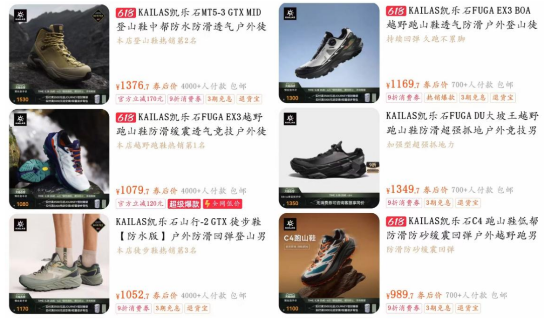 源Sight瞭解到,凱樂石越野鞋價格在600-2500元左右,熱銷產品在800-1500元區間,如在短距離賽事中頗受歡迎的FUGA DU大坡王,價格在1300-1500元左右。HOKA、昂跑、薩洛蒙等熱銷越野鞋與凱樂石處同一價格段,HOKA、薩洛蒙的部分熱銷款起步價甚至低於凱樂石。