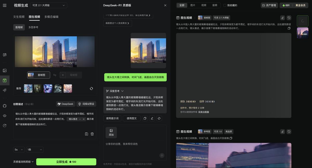 值得一説的是,可靈接入了DeepSeek-R1靈感版大模型,用起來更方便一些。再加上可靈剛發佈了2.1版本,我就簡單講講用完可靈的感受。