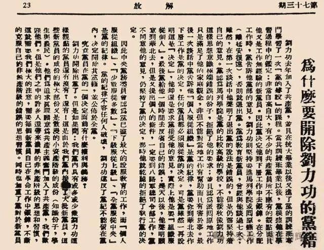 黨中央機關刊物《解放》刊發陳雲文章《為什麼要開除劉力功的黨籍》