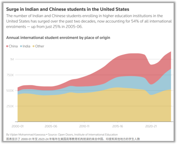 僅2023年,中國留學生就為美國創造了150億美元的收入,佔他們教育服務出口總額的33%。