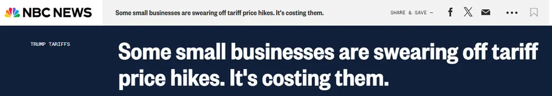 目前,沃爾瑪和梅西百貨等大型零售商均已表示,由於進口商品成本升高,他們不得不提高價格。大企業的情況尚且如此,中小企業則更加不容樂觀。美國全國廣播公司新聞網(NBC News)的報道提到,許多美國小企業經營者認為,不斷變化的關税對他們的生存構成了威脅。