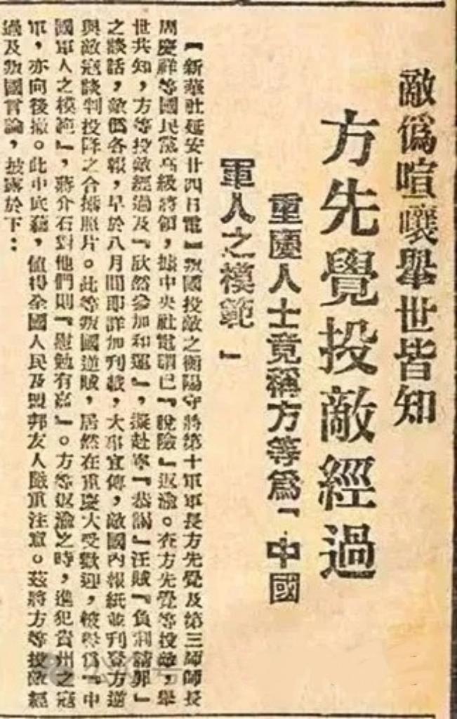 早在衡陽戰鬥後不久,對方先覺,延安和重慶就已經有了截然不同的兩種定性。延安方面將其所作所為定性為“叛國投敵”,而重慶方面將其標榜成“中國軍人之模範”。就因為這個,所以今天的公知果粉必須要力挺方先覺為抗日名將不可了。