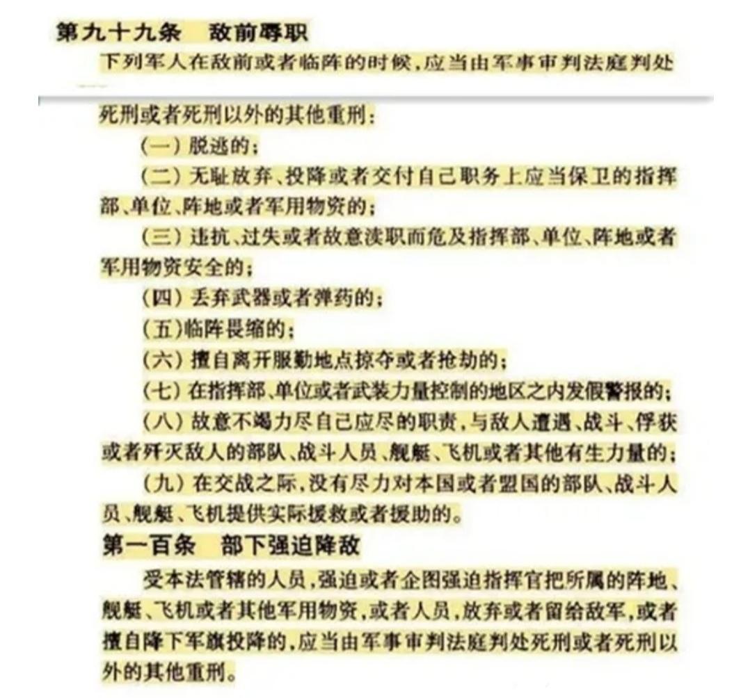 “無恥放棄、投降或交付自己職務上應當保衞的指揮部、單位、陣地或軍用物資的”,“應當由軍事審判法庭判處死刑或死刑以外的其他重刑。”