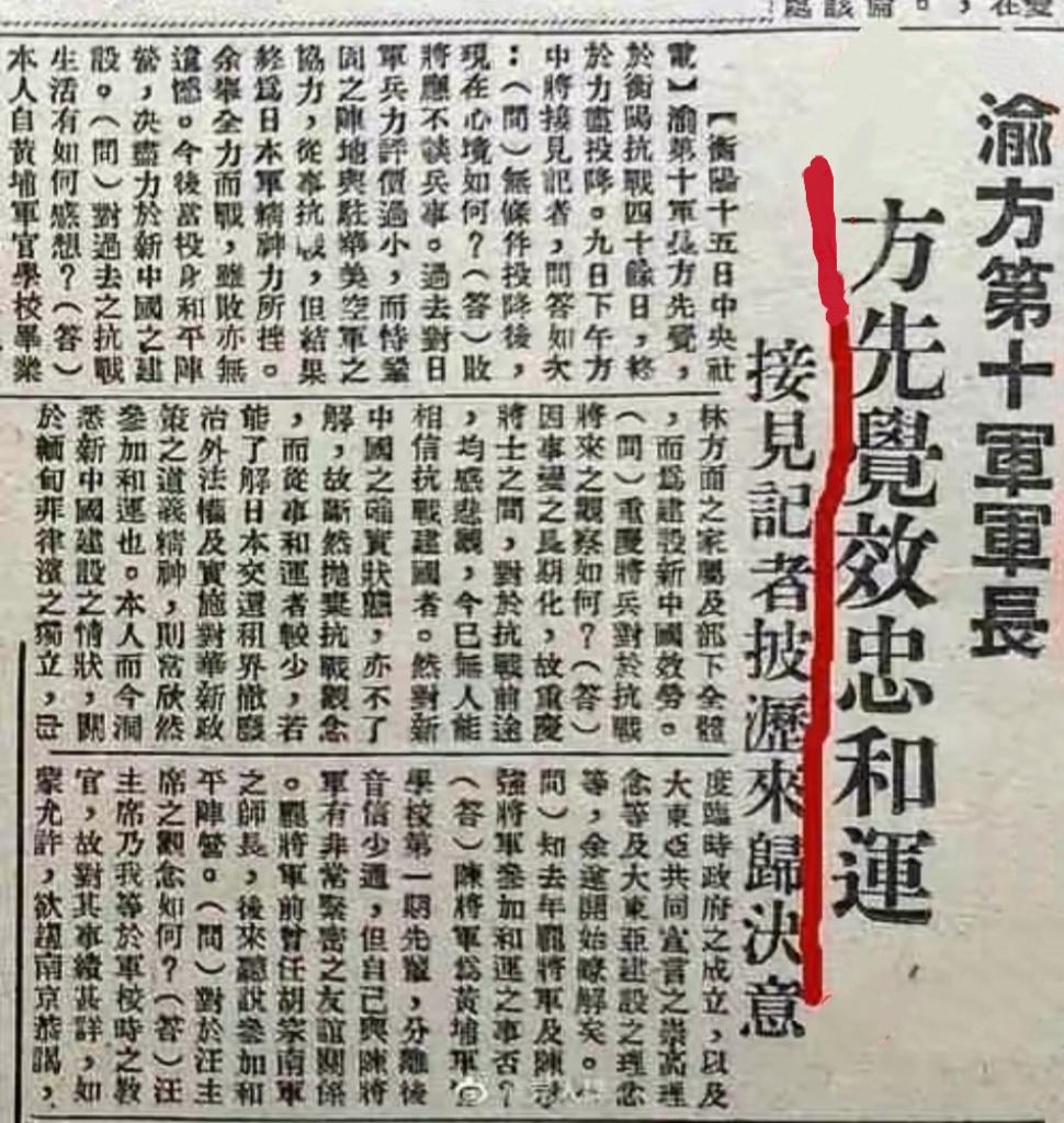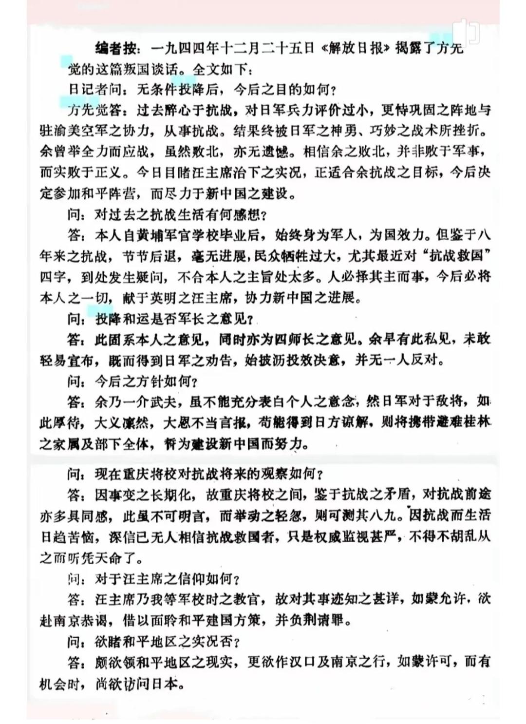 方先覺也不僅僅是投降,投降後他參加汪偽“和運”,發表跪舔汪偽和日本侵略者的賣國言論,充當偽“先和軍”的軍長,其行為是徹頭徹尾的投敵叛國。
