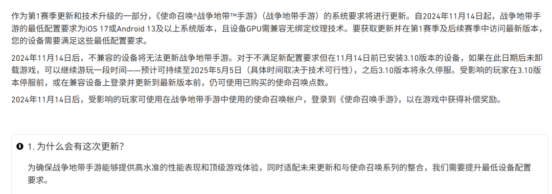起初玩家還保有一定耐心,將希望寄託在後續更新上,然而經過動視一年的“實驗性更新”,穩定的遊戲沒等來,動視最後反倒把更多玩家趕了出去——去年年末4.0版本更新後,動視宣佈再度提高《戰區手遊》的運行門檻,此前好歹還能勉強運行遊戲的手機,一場更新過後被直接徹底拋棄。