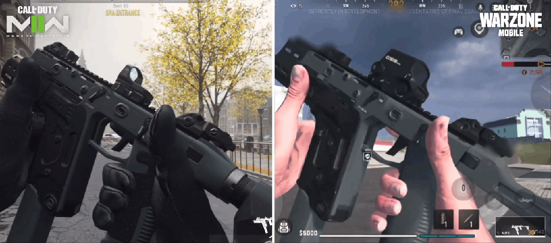 具體是怎麼個“驚喜”,簡單形容就是動視“把端遊直接塞到了手機裏”——《戰區手遊》的音效、動作模組、槍械建模等一票設計,和當時尚未推出的COD19基本一致,就像玩家在《戰區手遊》視頻下調侃的那樣:“不知道的還以為在看COD19的演示。”