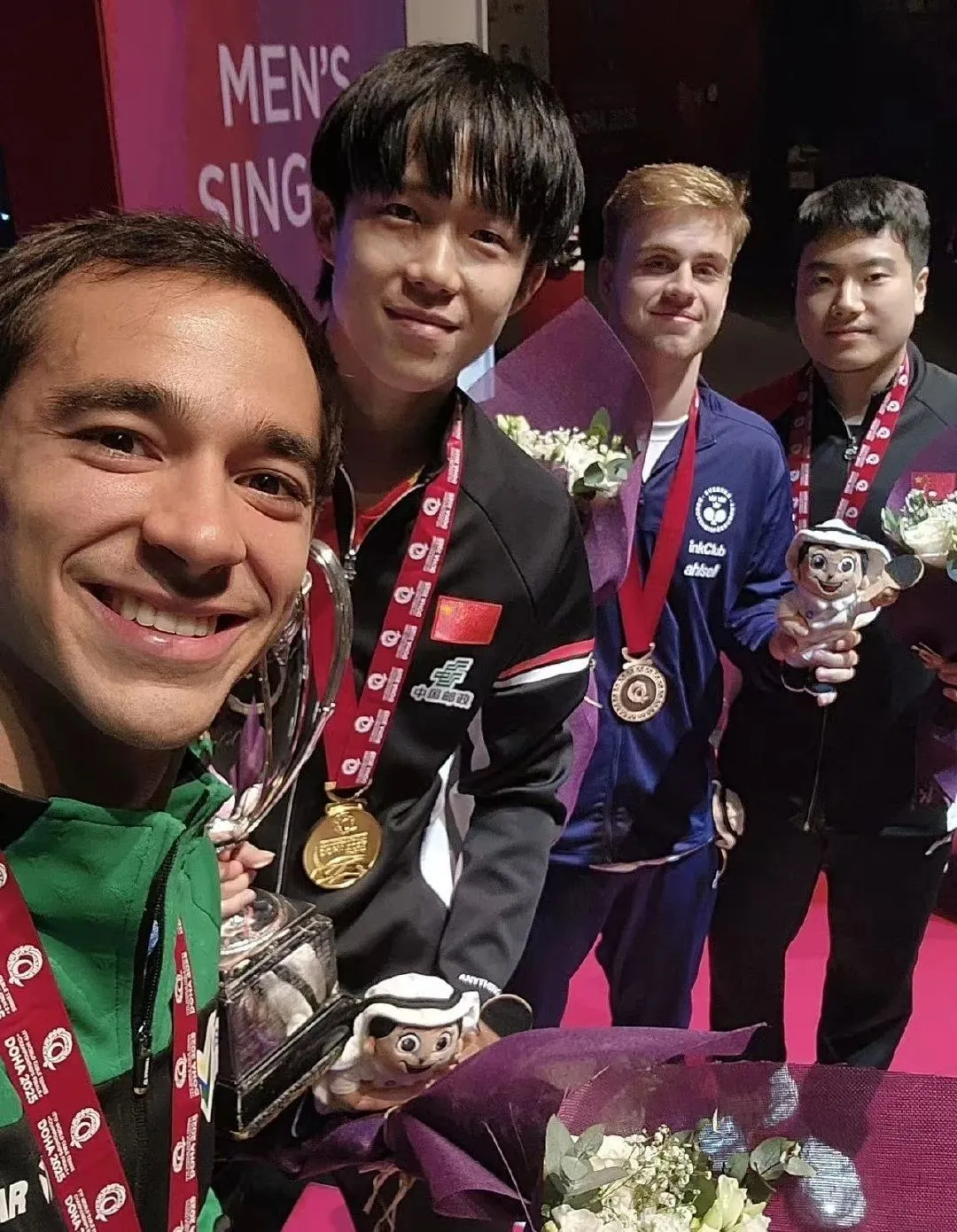 當下最閃光的,當然是一個人獨力將美洲帶到世界盃冠軍的雨果,這一次他又將“巴西”印在了多哈世乒賽的場地,奪得男單銀牌,再一次創造巴西乒乓球的歷史。