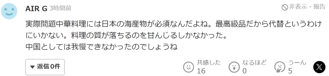 “實際上中國菜必須用日本的海產品吧。因為是最高級的食材,無法替代。只能忍受料理品質的下降。中國方面大概是無法容忍這種情況了吧。”