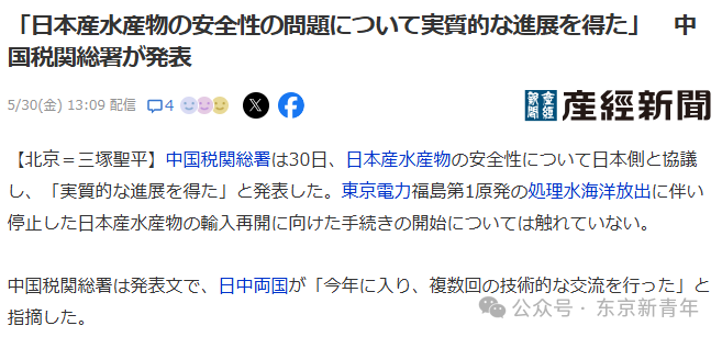 中國海關總署發佈內容為:“5月28日,中方應約在北京同日方就日本水產品安全問題進行新一輪技術交流,取得實質性進展。今年以來,雙方進行了多輪技術交流。”