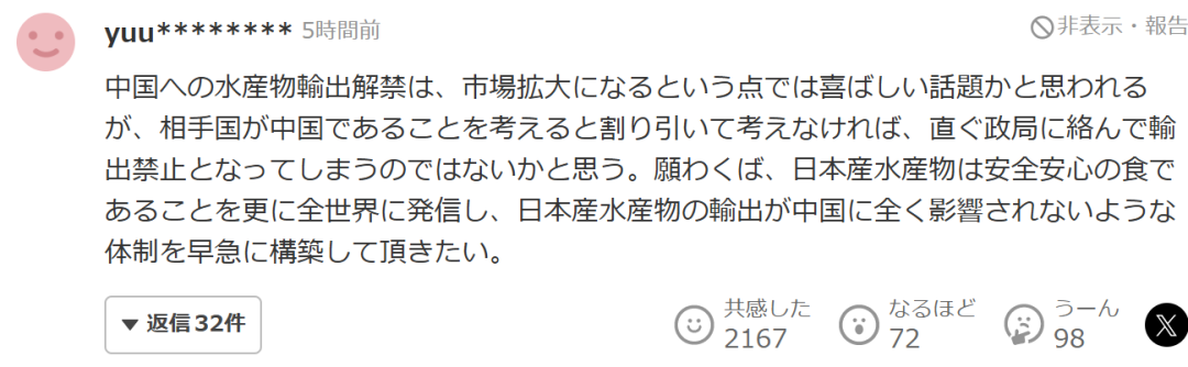 “水產品恢復對華出口雖然從擴大市場的角度來看似乎是值得高興的消息,但考慮到對方是中國這一事實,必須謹慎看待——很可能轉眼間又被局勢牽連而遭禁運。衷心希望日本能進一步向全球宣傳"日本水產是安全放心食品"的形象,儘快建立完全不受中國影響的日本水產出口體系。”