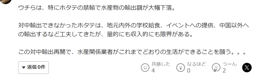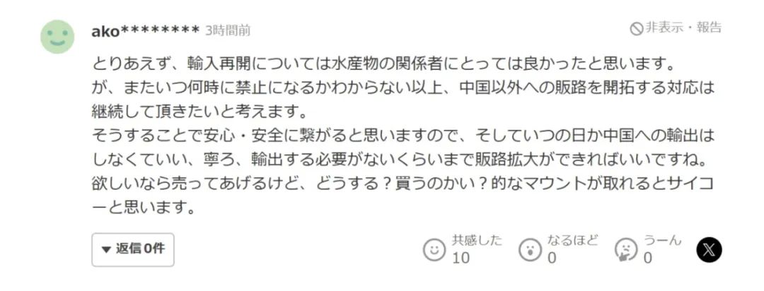 但是也有一些日本網友認為此次中方再開進口日本水產是件好事,最起碼日本漁民不用擔心沒有收益了。