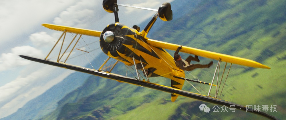 然後,他會在上萬米的高空攀附在雙翼飛機充作“掛件”,展示各種高難度動作,每次動作變化都讓觀眾揪心。