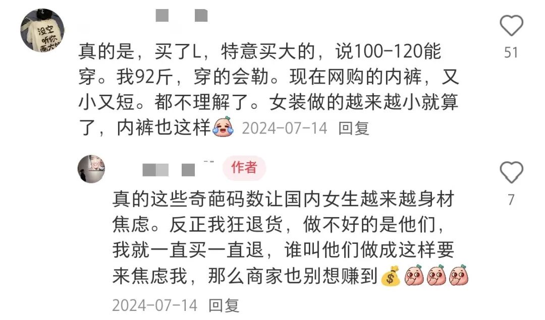 和女裝尺碼越做越小相似,女士內褲的尺碼也“通貨膨脹”,普遍偏小。梁爽買的白牌內褲,據商家介紹説,80至100斤的女性可以選擇M碼。她想着,自己身高155釐米,才90斤,“M碼我是妥妥的”。結果尺碼太小,她的大腿根被褲邊勒得發紅,腰上也印上了鬆緊帶細密的紋理。