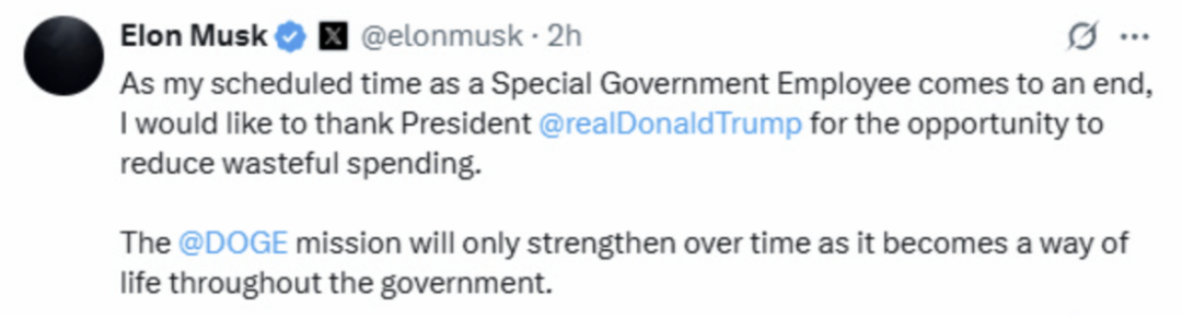 本週三,馬斯克在自己的X賬號上PO文宣佈,表示自己在特朗普政府任期已滿,準備離職。