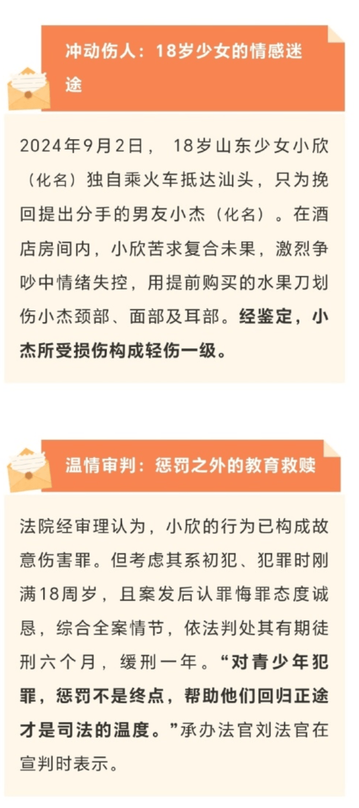 2024年9月2日,一名剛滿18歲的山東女子乘坐火車抵達汕頭。在酒店房間內,她試圖挽回提出分手的男友,但遭到拒絕。於是,該女子用事先準備好的水果刀劃傷了男友的頸部、面部及耳部。
