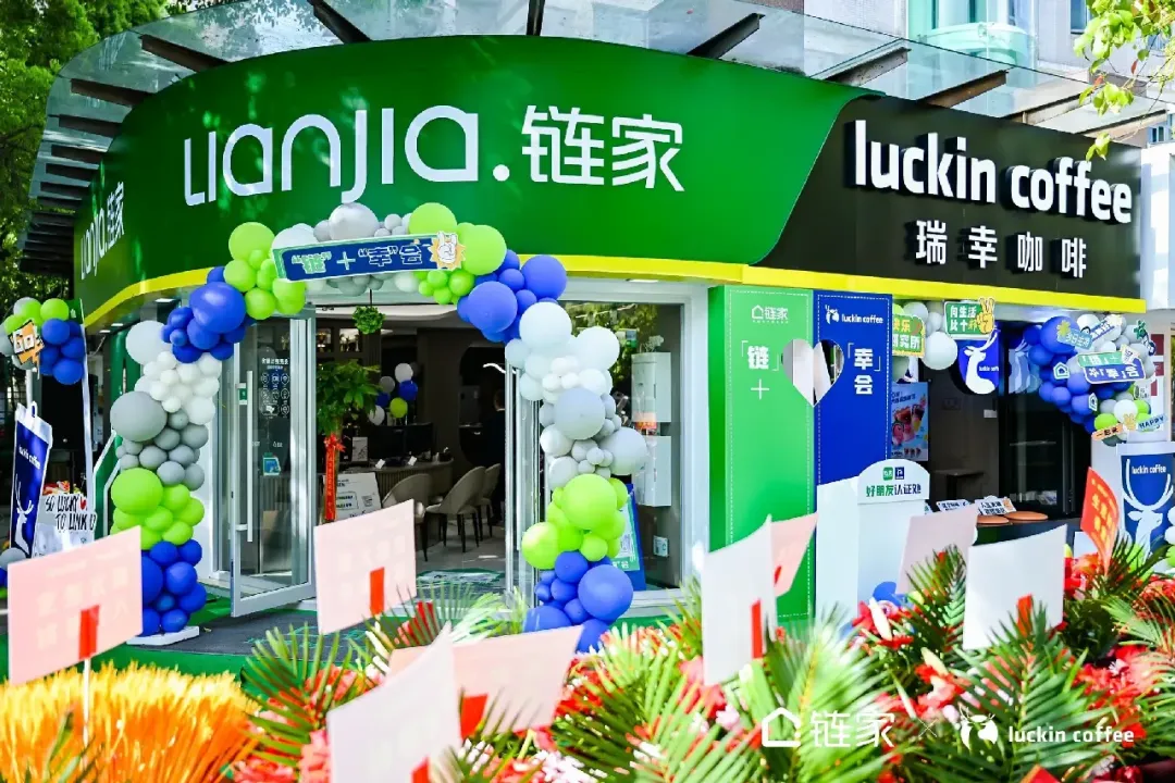 4月14日,瑞幸與鏈家首個共享門店正式開業,“咖啡+房產”的物理空間疊加模式,某種程度上類似此前庫迪佈局的店中店模式。