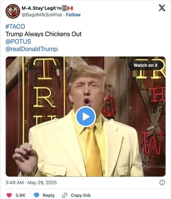面對各方質疑,特朗普總統在多個場合進行了強硬回應。5月29日的記者會上,當被問及對“TACO”説法的看法時,特朗普反問道:“我膽怯了?哦,我從來沒聽説過。”他堅持認為這是談判策略的一部分:“永遠不要再説你説過的話。這叫談判藝術。”