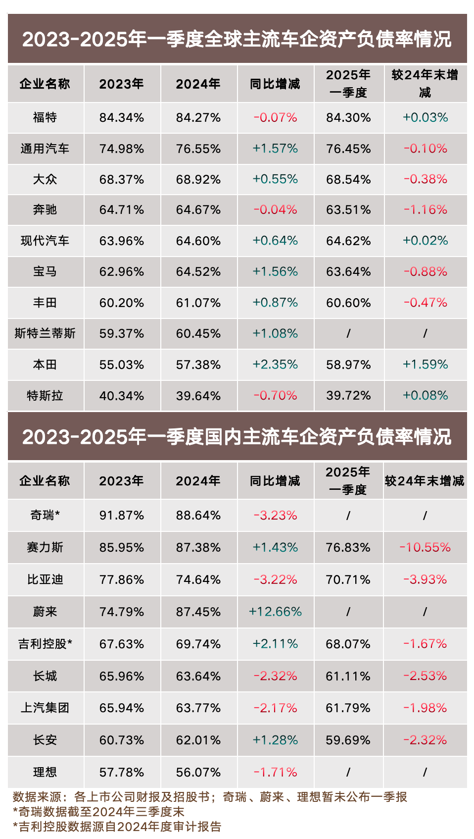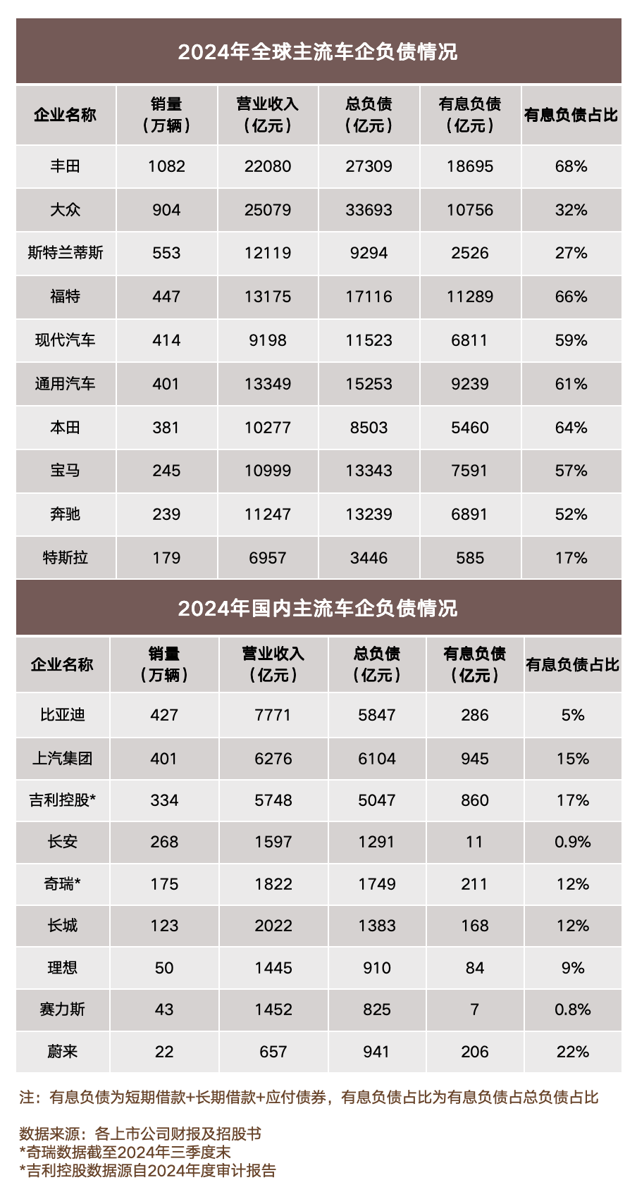 再看國內主流車企。奇瑞(88.64%,截至2024Q3)、蔚來(87.45%)、賽力斯(87.38%)、比亞迪(74.64%),以及吉利、上汽、長城、長安等主流車企,負債率同樣普遍維持在60%以上。