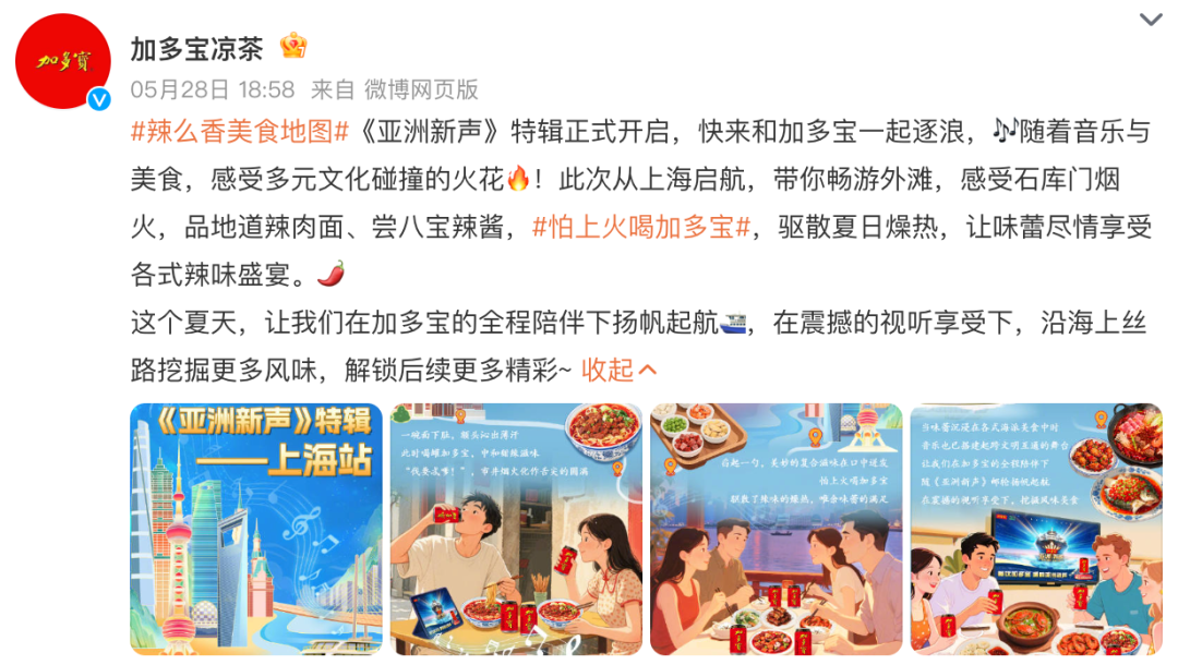 《亞洲新聲》將節目設置在遊輪上,郵輪搭載着中外歌手,經過中外多地,將競賽與日常結合。在這樣的設置下,以《亞洲新聲》特輯之名,加多寶也順勢將節目營銷與其此前聯合地方文旅發起的美食推廣活動“辣麼香美食地圖”結合,繼續深化其“辣味+涼茶”組合的品牌心智。首期節目從上海起航,加多寶推出了《亞洲新聲》特輯上海站的辣味美食。此外,它面對即將到來的假期,還邀請網友們打卡節目同款旅行地標、解鎖各式美食等,以“先出發再説”,贏得了不少網友的點贊。