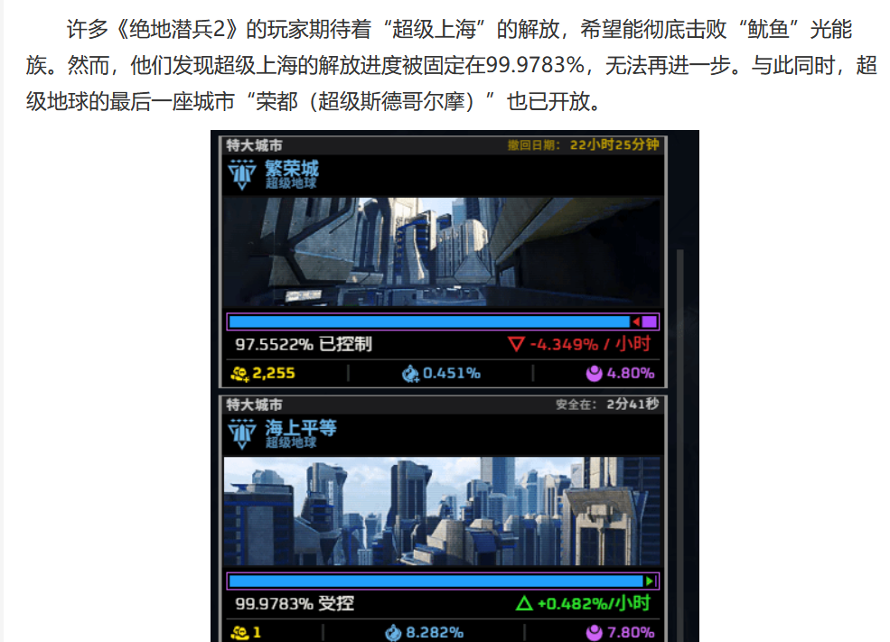 按照Arrowhead的構想,這場戰役應當以“階梯式淪陷”的劇本展開,在各個超級城市快速失守後,全球玩家集結在榮都(超級斯德哥爾摩)進行最終保衞戰,實現終極逆轉。但現實卻與預設背道而馳,超級上海在玩家的頑強堅守下屹立不倒,解放度被卡死在99.9783%,彷彿在嘲諷玩家的“無能為力”與廠商的敍事霸權。