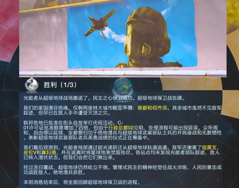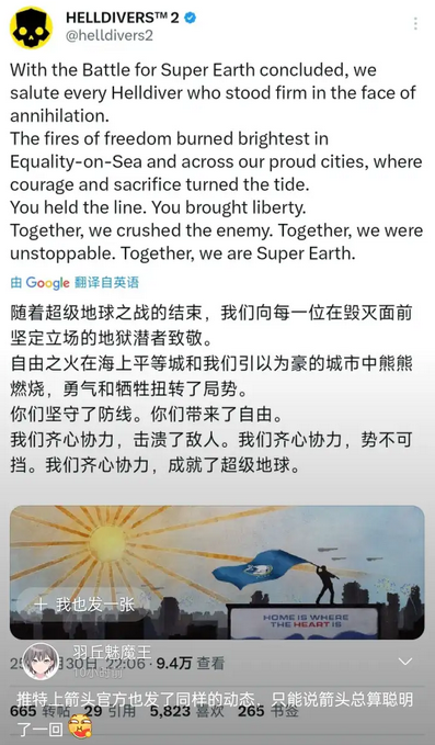 最後,遊戲方在全球玩家的團結抵抗下不得不改了事先設定好的劇本。5月30日,Arrowhead在遊戲內宣佈,“戰鬥第11天,太陽在超級地球升起。榮都與自戰鬥開始便屹立不倒的城市【仰齊浜】成功擊潰光能者艦隊。超級地球保衞戰告捷。”這種我和科比合砍50分的自信顯然是一種比阿美利加更有趣的贏學。