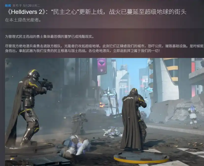 然而,就在 2025年5月20日,《絕地潛兵 2》上線的新版本 “民主之心” 中,一場意外打破了遊戲原本預設的敍事節奏。該版本以“光能者入侵超級地球七座城市”為核心劇情,玩家需協同防守。這七座城市分別為榮都(超級斯德哥爾摩)、仰齊浜(超級上海)、棒約克(超級紐約)、馨家泊(超級新加坡)、鷹都(超級耶路撒冷)、緬城(超級布宜諾斯艾利斯)、行政總部02(超級布魯塞爾)。