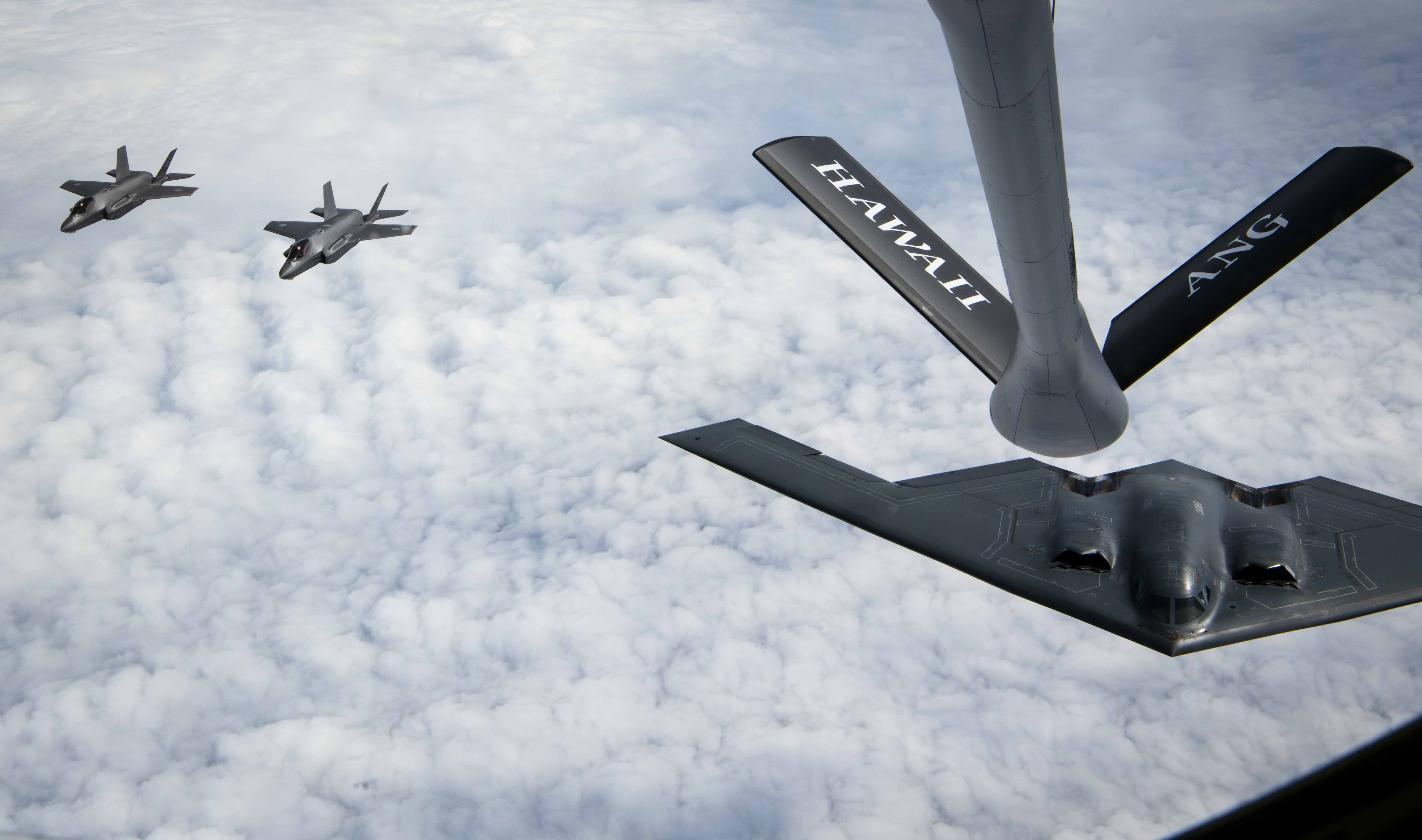 一架美國空軍B-2“幽靈”隱形轟炸機和四架日本航空自衞隊的F-35A戰鬥機在印太責任區上空編隊飛行。美國空軍照片由高級軍士薩曼莎·懷特拍攝
