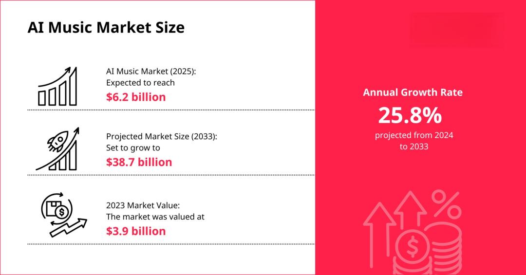 市場研究公司Market.us報告稱,如今60%的音樂人使用AI工具創作,預計2025年AI音樂市場規模將達到62億美元,到 2033年將增長至387億美元,預測期內的年增長率將達到驚人的25.8%。