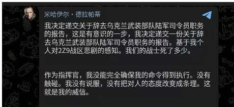 對此烏克蘭武裝部隊陸軍總司令 Drapaty 表示在今天對烏克蘭武裝部隊訓練基地遭遇襲擊事件承擔責任,主動辭職。其表示這是一個深思熟慮的步驟,由於我個人對第 239 訓練場悲劇的責任決定,我們的士兵因此喪生。作為一名指揮官,我無法完全確保我的命令得到執行,他寫道。