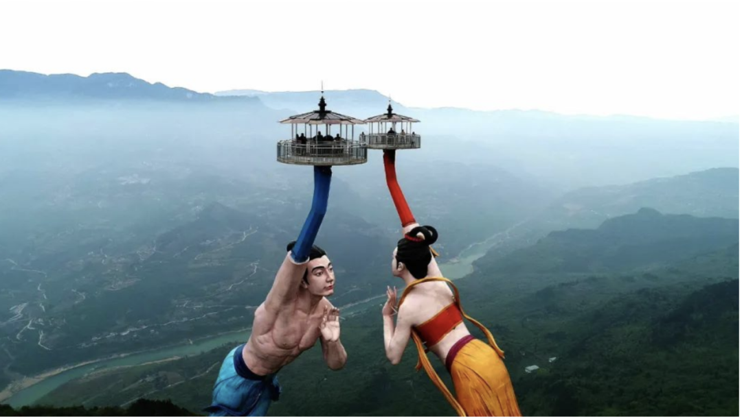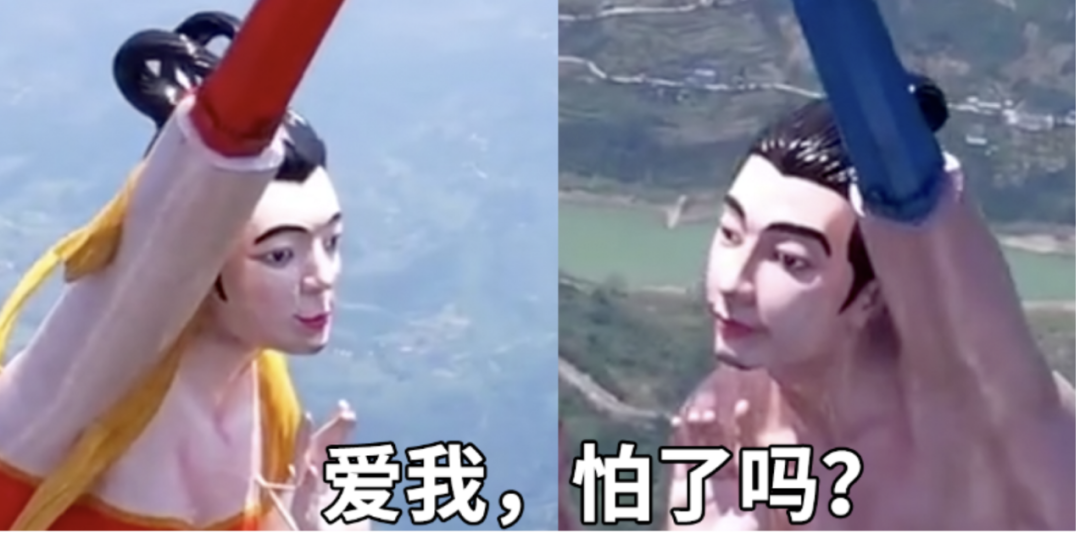 重慶“飛天之吻”網紅打卡點,講述了一個動人的故事——東海龍王敖廣的兒子敖嘲風與七仙女張天陽一見鍾情,雖然噱頭拉滿,實物卻醜得讓人沉默。