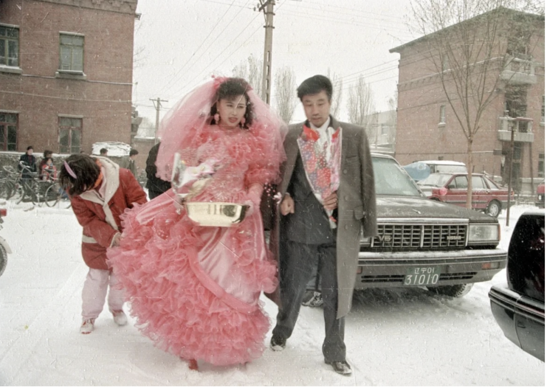 就連婚禮當天,也沒有精心的構圖,只拍下了那年那天的大雪紛飛中,新娘穿着粉色婚紗的模樣。