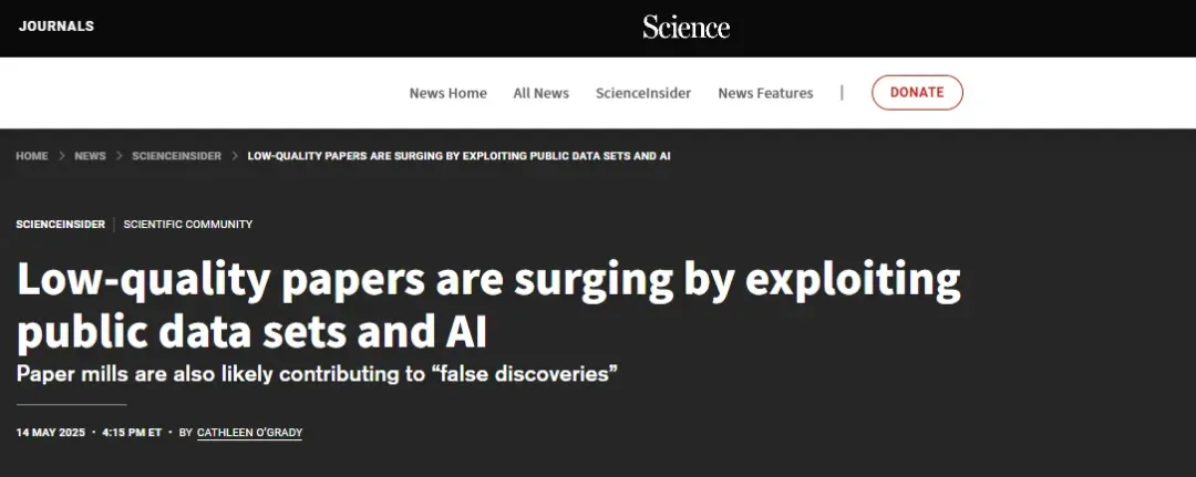 5月14日,Science《科學》在其線上新聞專欄Science Insider報道了一項令人震驚的研究發現:近3年來,利用美國健康與營養調查(NHANES)等公開數據庫發表的低質量論文數量激增,其中超過 92% 的論文由中國研究人員貢獻。這一現象被認為與“論文工廠”和人工智能(AI)技術的濫用密切相關。