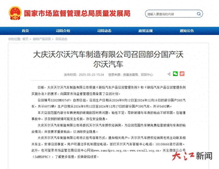 召回編號S2025M0074V:自即日起,召回生產日期從2024年9月12日至2024年12月16日的部分國產S60汽車,共計6973輛;生產日期從2024年9月12日至2024年12月17日的部分國產S90汽車,共計5492輛。