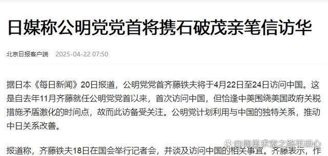 眾所周知,在美國對全世界發起關税戰的時候,日方就選擇了反抗,不過後者並沒有對美方的商品增加對等税收的膽子。 但就在今年4月22號,日本的重要政黨——公明黨的黨首齊藤鐵夫,開啓了一個為期三天的訪華行程,而且他還帶着石破茂親手寫的信。