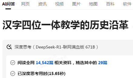 嗯,用户問的是漢字四位一體教學的歷史沿革,需要結合歷史對話裏的內容和搜索結果裏的信息來回答。我需要先理解四位一體具體指的是什麼,也就是識字、寫字、檢字、打字這四個方面的統一教學模式。歷史對話中提到,這個問題從80年代開始就有人研究,新世紀以來隨着技術進步,比如字根數碼檢字法和人工智能的發展,夏國民提出了這個四位一體的模式。