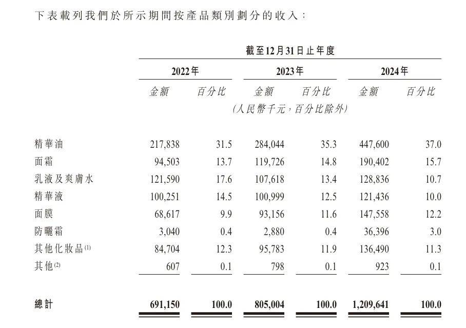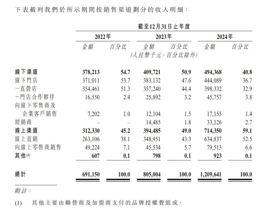 其中,林清軒的精華油收入佔比從31.5%升至37%,面霜、精華液等品類佔比均不足16%,依然存在大單品依賴的現象。而在渠道方面,線上收入佔比從45.2%增至59.1%,2024年達7.14億元,但線下門店擴張至506家後,收入貢獻反降至40.8%,線下門店不如線上貢獻多。並且,加盟的開放可能會削弱高端化形象。